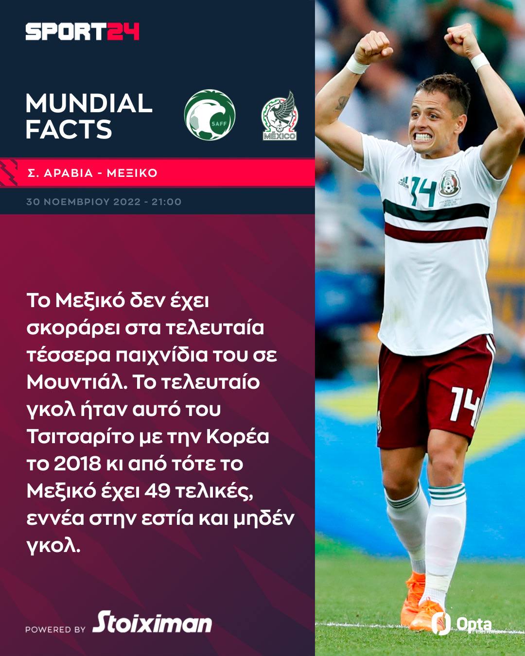 Το Μεξικό δεν έχει σκοράρει στα τελευταία τέσσερα παιχνίδια του σε Μουντιάλ. Το τελευταίο γκολ ήταν αυτό του Τσιτσαρίτο με την Κορέα το 2018 κι από τότε το Μεξικό έχει 49 τελικές, εννέα στην εστία και μηδέν γκολ.