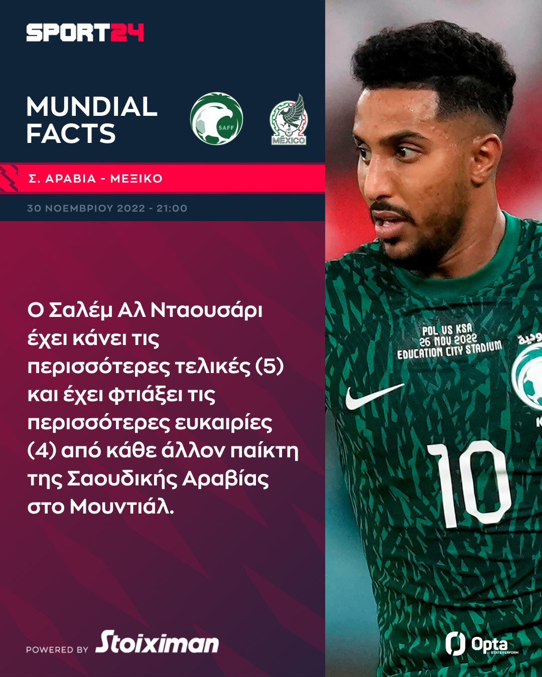 Η Σαουδική Αραβία θέλει να πετύχει την πρώτη της νίκη απέναντι στο Μεξικό (30/11, 21:00, antenna.gr, ANT1+ και Live SPORT24) και την πρόκριση στους 16 του Μουντιάλ 2022 για πρώτη φορά μετά το 1994. Η ομάδα του Τάτα Μαρτίνο έχει ελπίδες πρόκρισης μόνο σε περίπτωση νίκης.