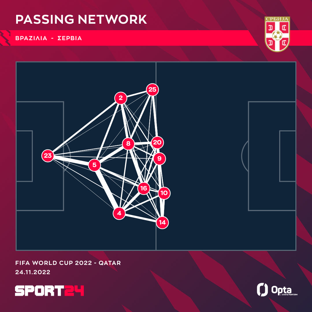 Ο Ντράγκαν Στόικοβιτς παρέταξε την ομάδα του με 3-4-3, με τον Ζίβκοβιτς να αγωνίζεται στη δεξιά πλευρά στη μεσαία γραμμή. Παρακάτω στο γράφημα της Opta/Stats Perform μπορείτε να δείτε το δίκτυο μεταβιβάσεων και τον χώρο δράσης των παικτών της Σερβίας.