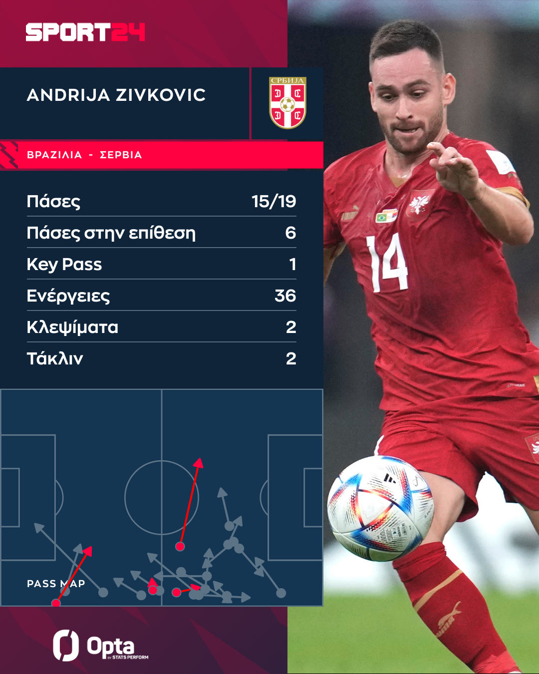 Ο Άντριγια Ζίβκοβιτς έκανε το ντεμπούτο του στο Παγκόσμιο Κύπελλο του Κατάρ στην αναμέτρηση της Σερβίας με τη Βραζιλία. Δείτε τα πεπραγμένα του τα 57 λεπτά που αγωνίστηκε.