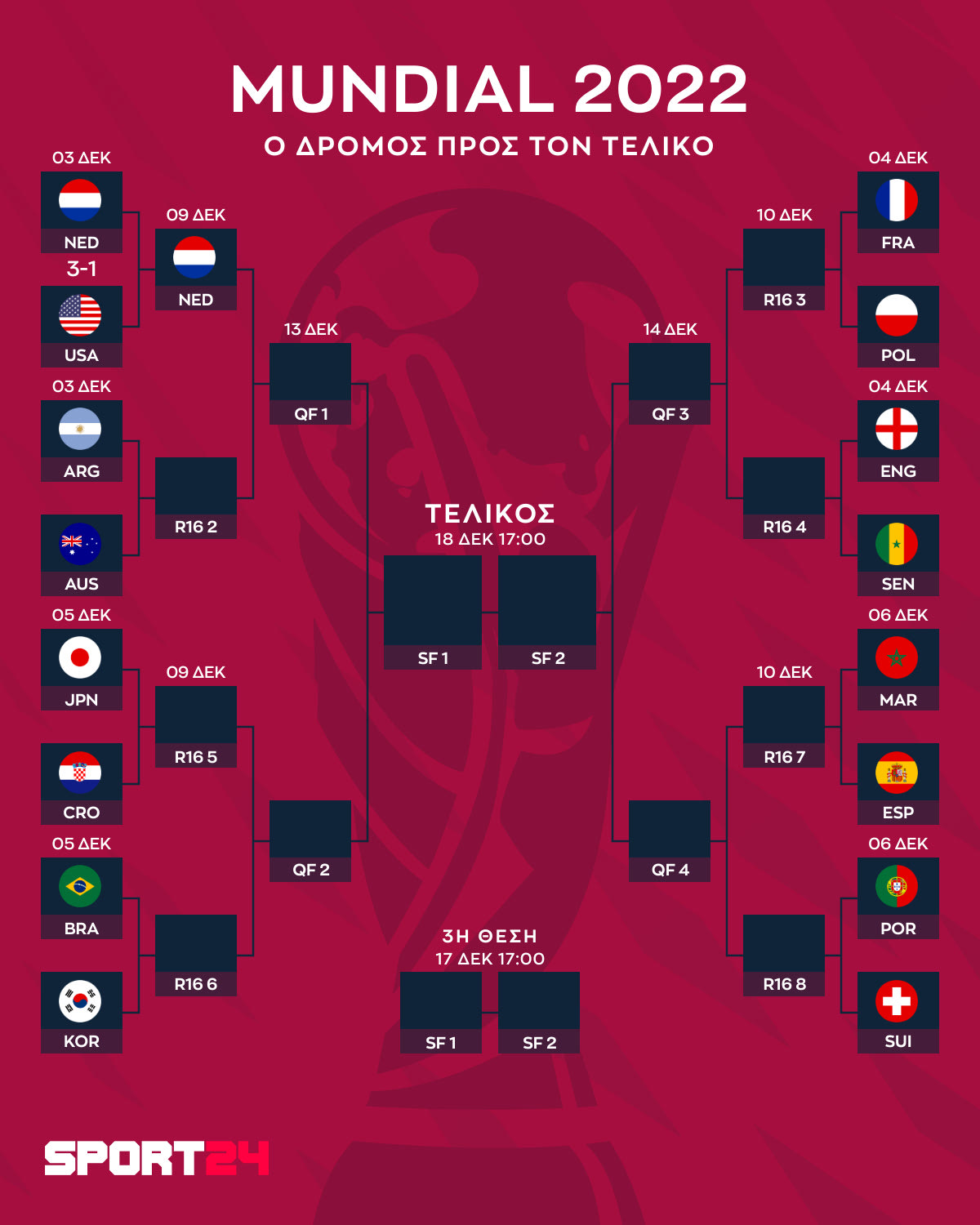 - 17:00 Ολλανδία – ΗΠΑ 3-1, (Διεθνές Στάδιο Khalifa, Ντόχα) – ΑΝΤ1 / ΑΝΤ1+