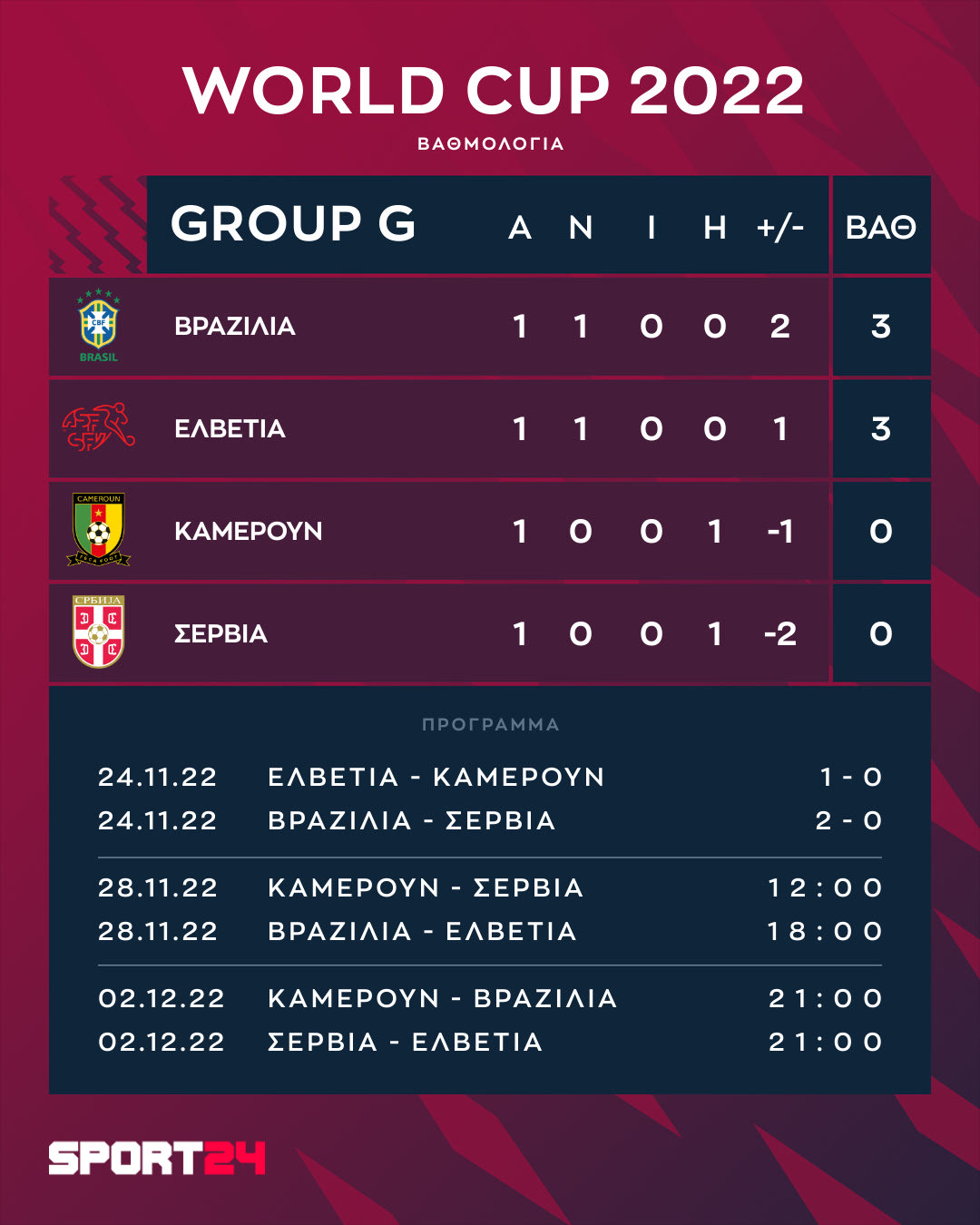 • 28/11, 12:00, Καμερούν – Σερβία (Al Janoub Stadium), ΑΝΤ1 / ΑΝΤ1+