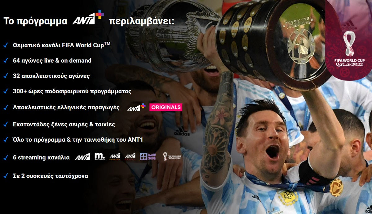 Ζήσε όλη την εμπειρία του FIFA World Cup Qatar 2022 και απόλαυσε όλο το περιεχόμενο του ΑΝΤ1+ μόνο με 3,33€/μήνα*.