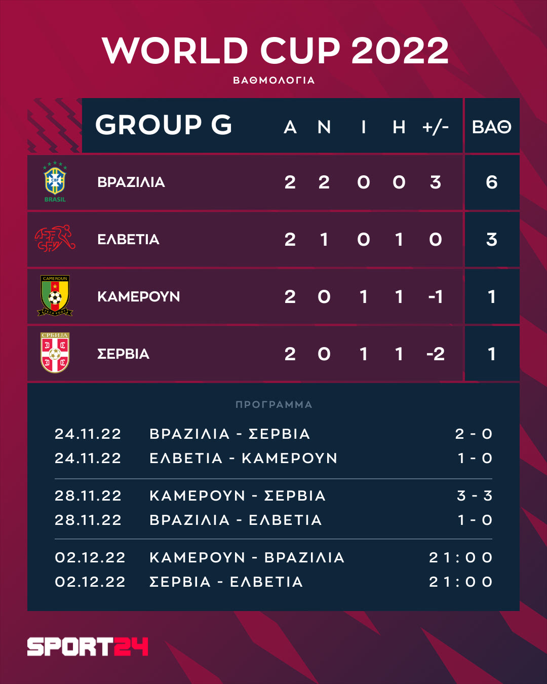 Στο 7ο όμιλο η Βραζιλία έχει προκριθεί με έξι βαθμούς. Ακολουθεί η Ελβετία με τρεις, το Καμερούν και η Σερβία με έναν.