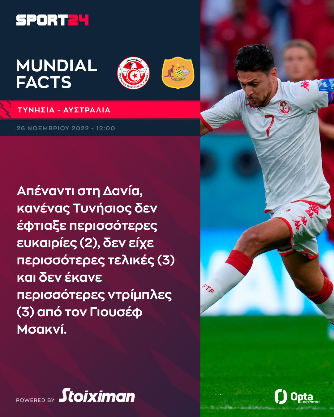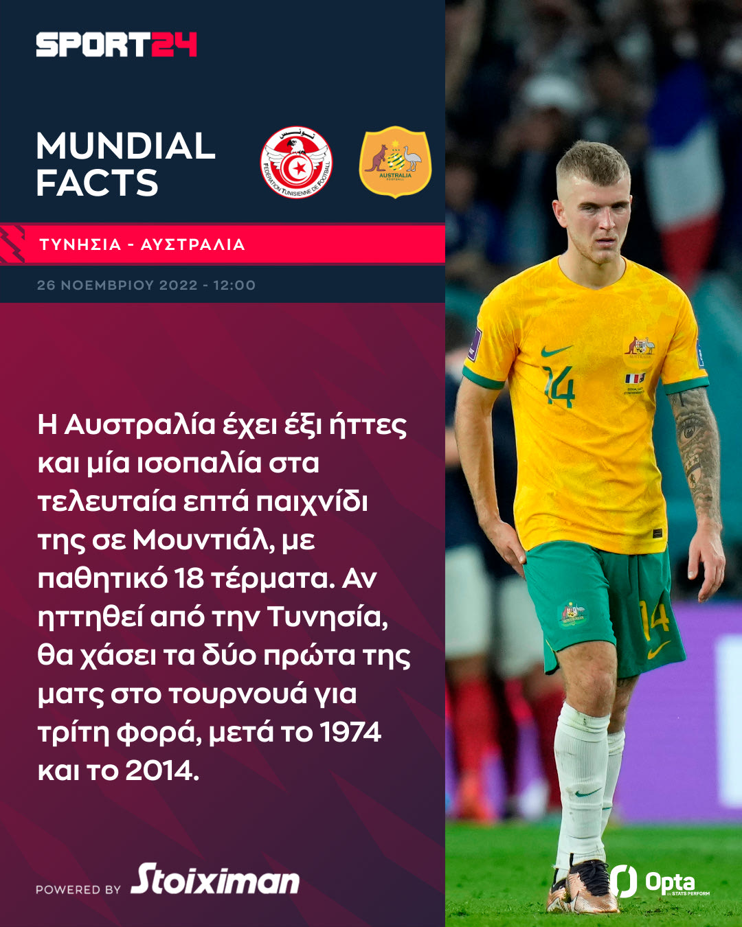 Η Αυστραλία αντιμετωπίζει την Τυνησία (26/11, 12:00, ΑΝΤ1, ΑΝΤ1+, LIVE SPORT24) για τη δεύτερη αγωνιστική του τέταρτου ομίλου. Δείτε ενδιαφέροντα facts για το παιχνίδι με τη βοήθεια της Opta.