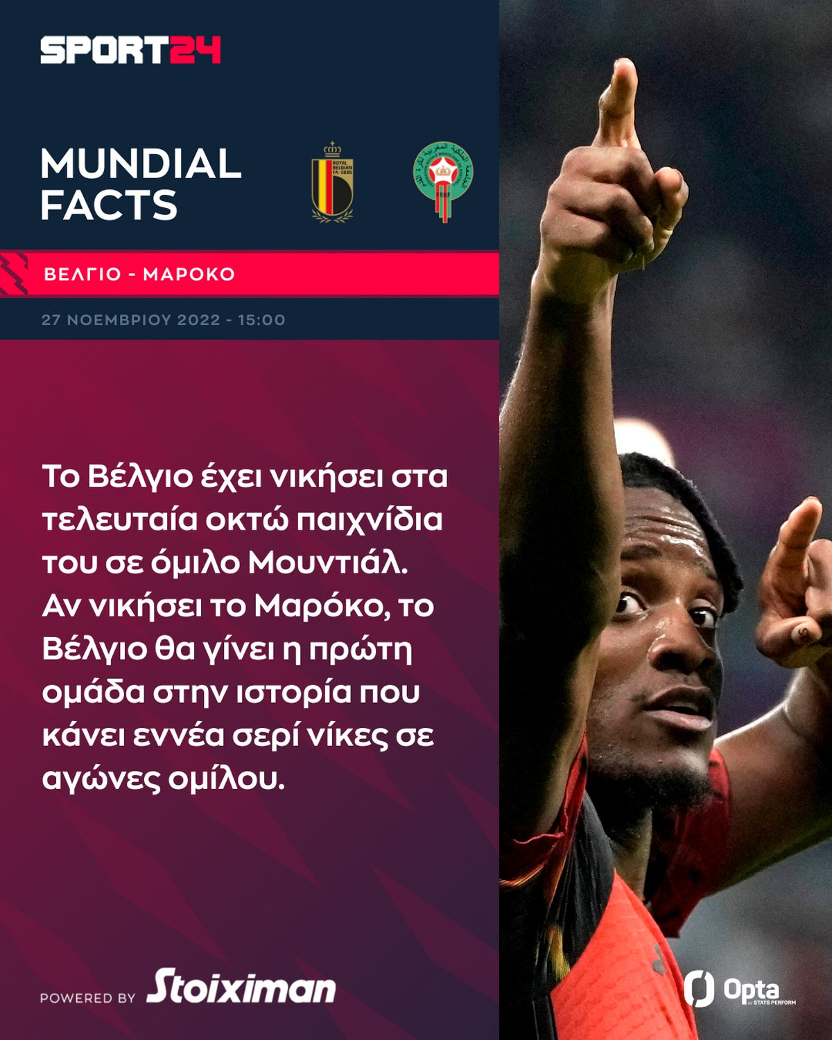Το Βέλγιο έχει νικήσει στα τελευταία οκτώ παιχνίδια του σε όμιλο Μουντιάλ. Αν νικήσει το Μαρόκο, θα γίνει η πρώτη ομάδα που κάνει εννέα σερί νίκες σε αγώνες ομίλου.