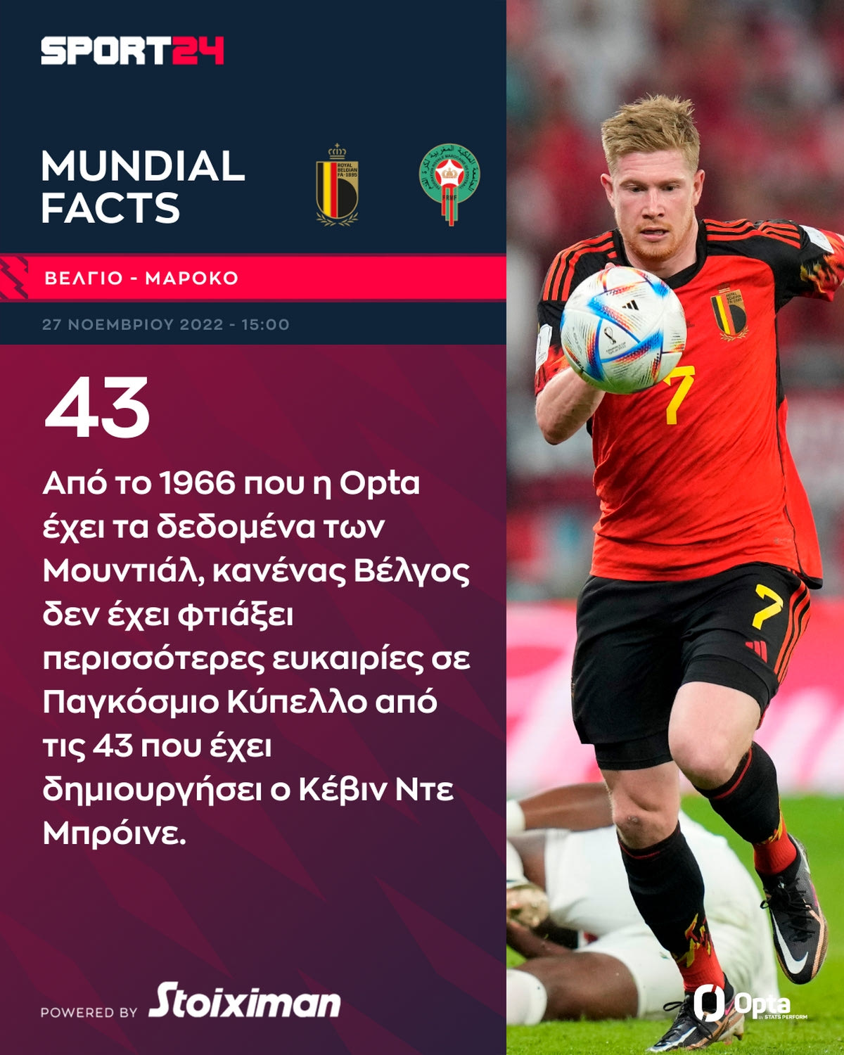 Ο Κέβιν Ντε Μπρόινε έφτιαξε τις περισσότερες ευκαιρίες του Βελγίου στη νίκη επί του Καναδά (4). Από το 1966, κανένας Βέλγος δεν έχει φτιάξει περισσότερες ευκαιρίες σε Μουντιάλ από τις 43 που έχει δημιουργήσει ο Ντε Μπρόινε.