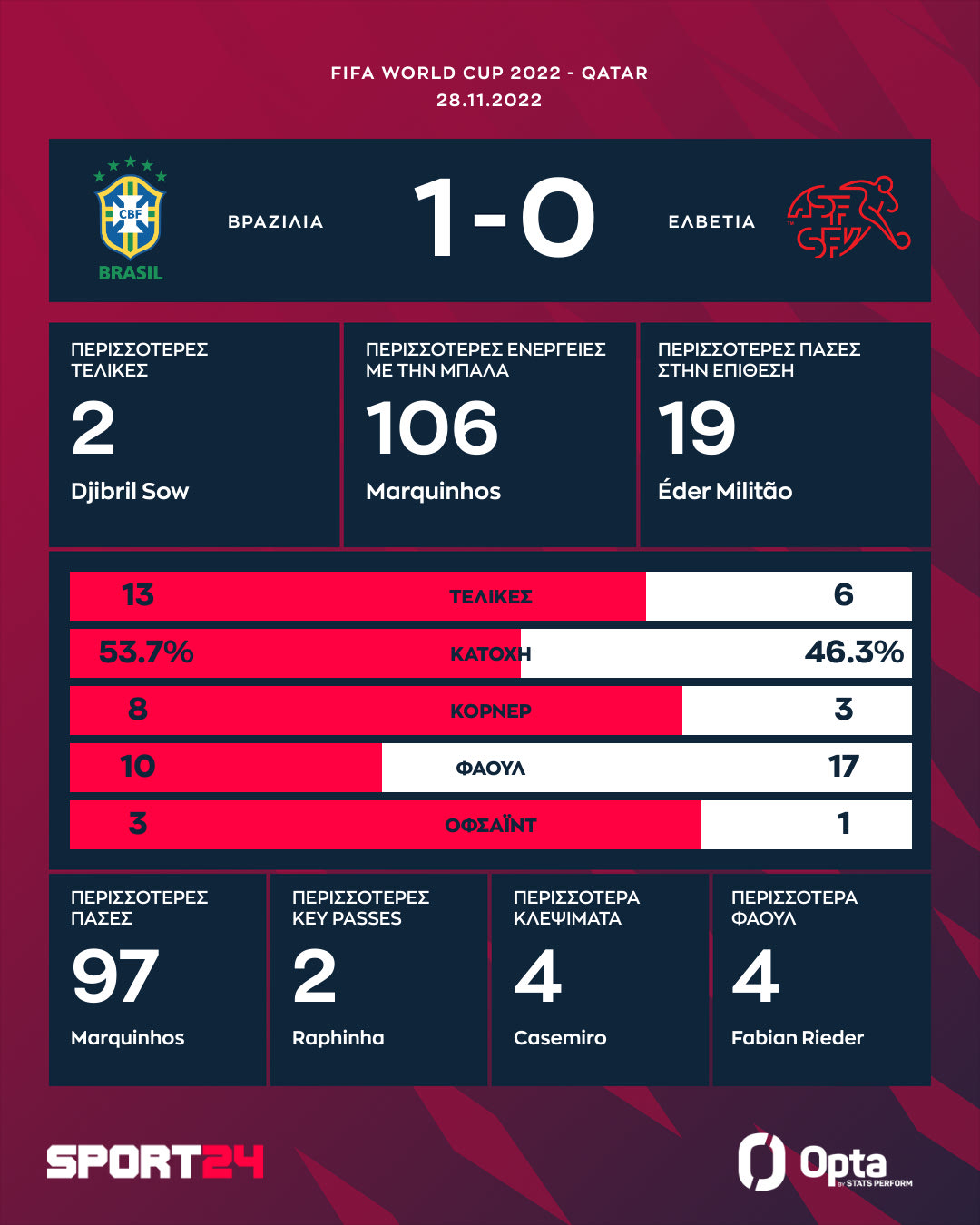 Τα στατιστικά του αγώνα Βραζιλία - Ελβετία OPTA/SPORT24