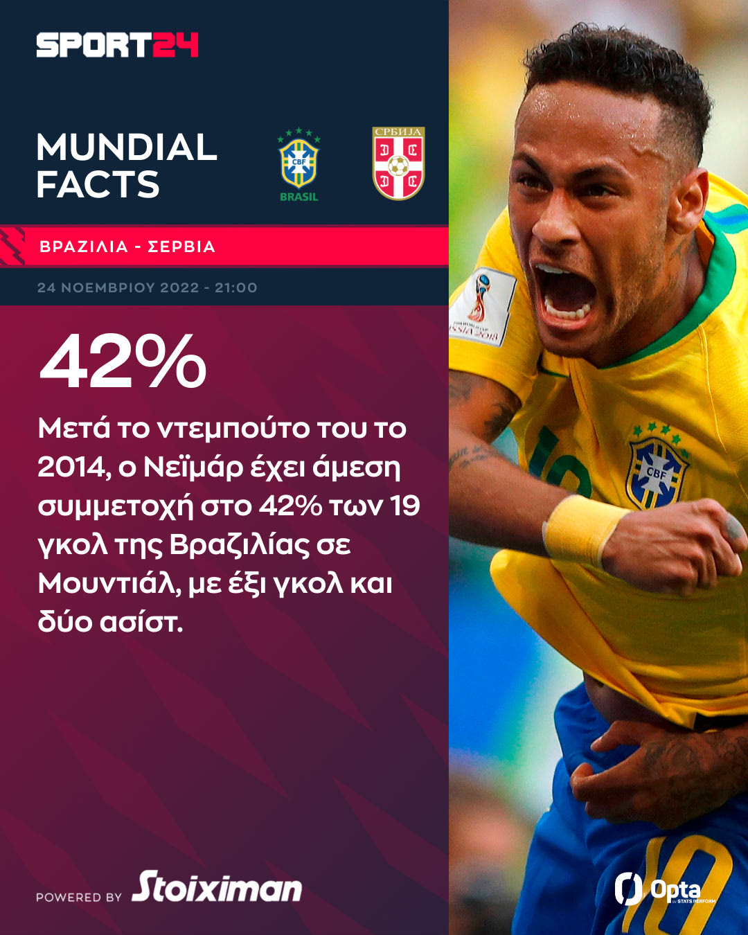 Η Βραζιλία και η Σερβία διασταυρώνουν τα ξίφη τους στο Lusail Iconic Stadium για την πρώτη αγωνιστική του έβδομου ομίλου του Μουντιάλ. Δείτε ενδιαφέροντα facts για την αναμέτρηση.