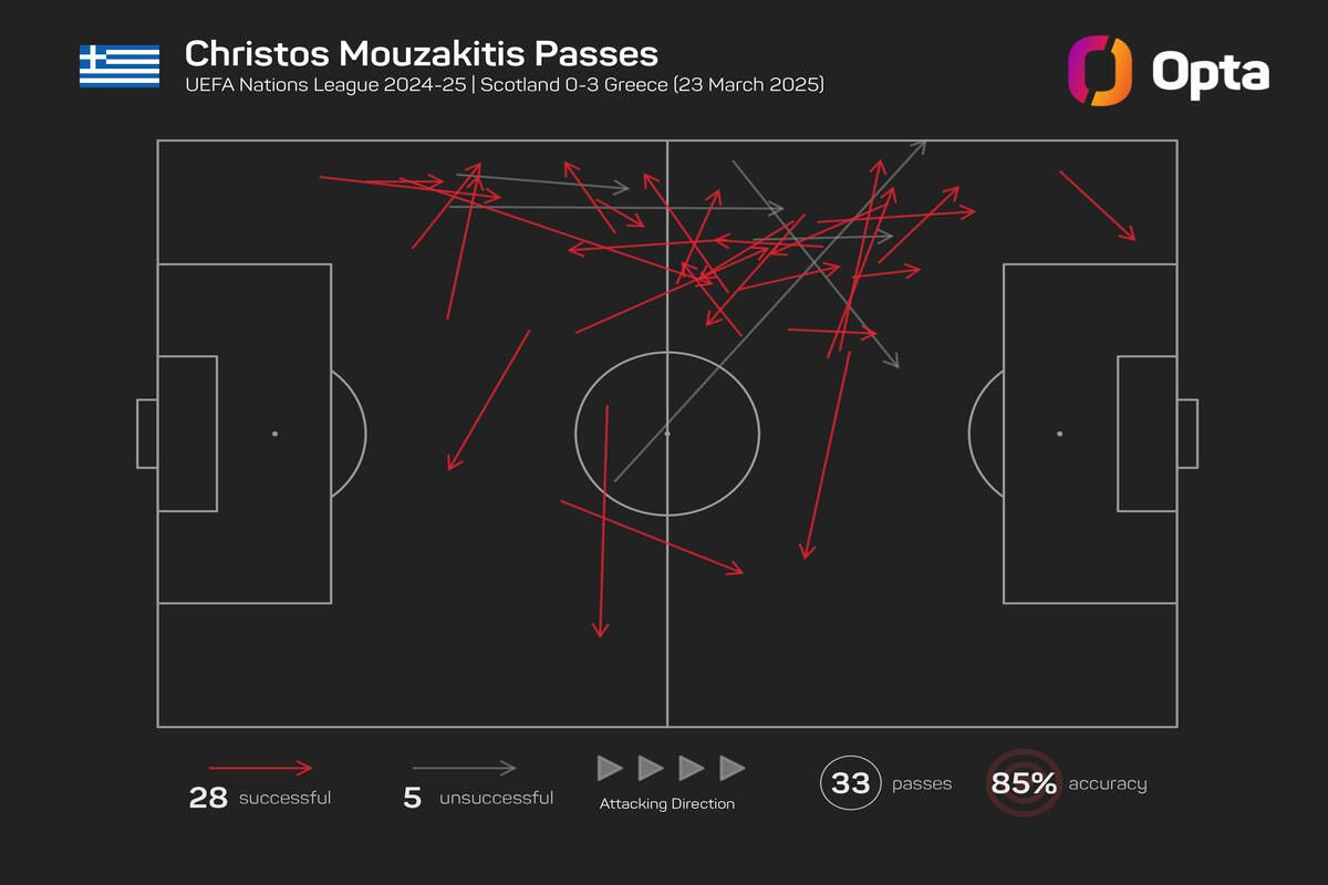 Ο Χρήστος Μουζακίτης είχε 28 επιτυχημένες πάσες στις 33 που επιχείρησε, καταγράφοντας εντυπωσιακό ποσοστό ακρίβειας στις μεταβιβάσεις του που “άγγιξε” το 85%.