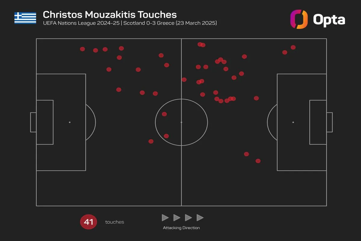 Ο Μουζακίτης είχε 41 επαφές με την μπάλα, με πιο κομβική από όλες τη μεταβίβαση στον Γιαννούλη λίγο πριν την ανάπαυλα, από την οποία ξεκίνησε και το δεύτερο γκολ της ομάδας του Γιοβάνοβιτς που σημείωσε ο Καρέτσας.