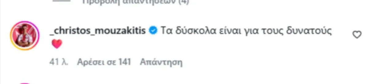 Στην ανάρτησή του σχολίασε και ο Χρήστος Μουζακίτης, με τον ποδοσφαιριστή του Ολυμπιακού να αναφέρει: “Τα δύσκολα είναι για τους δυνατούς”.