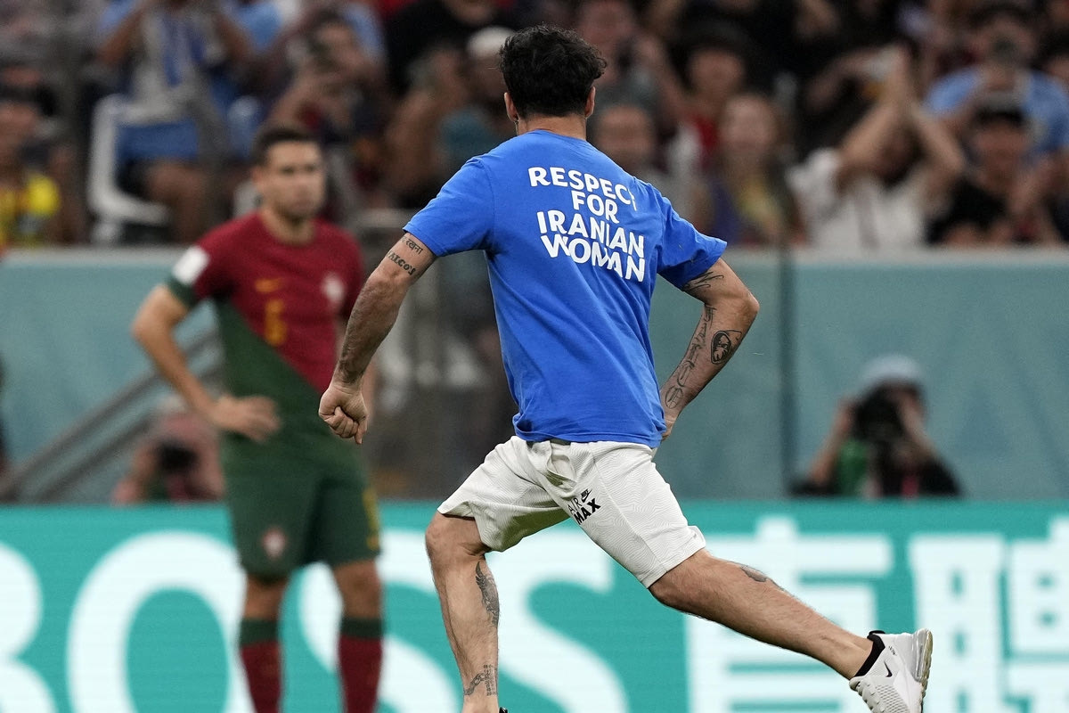 Στο 50ο λεπτό της αναμέτρησης Πορτογαλία – Ουρουγουάη ένας ακτιβιστής εισέβαλε με σημαία του ουρανίου τόξου στον αγωνιστικό χώρο, με αποτέλεσμα το ματς να διακοπεί για λίγα λεπτά. Ο εν λόγω άνδρας φορούσε φανέλα Superman που είχε πάνω της μηνύματα υπέρ της Ουκρανίας και των Ιρανών γυναικών.