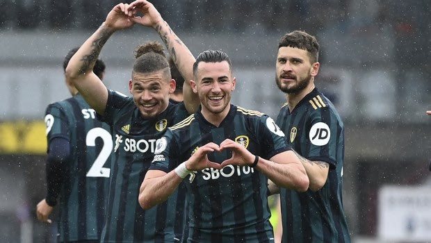 Leeds United's Jack Harrison, center, celebrates after scoring his side's second goal during the English Premier League soccer match between Burnley and Leeds United at Turf Moor in Burnley, England, Saturday May 15, 2021. (Gareth Copley/Pool via AP) @ 2021 Gareth Copley/Associated Press