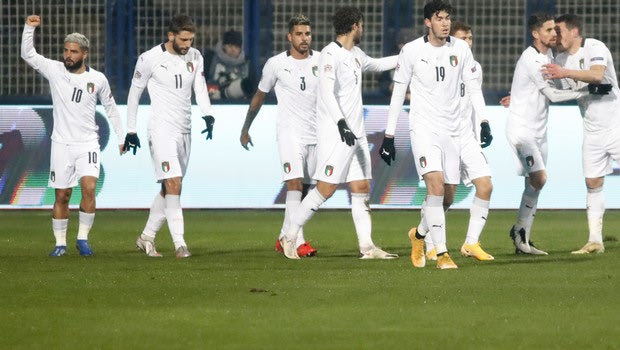 Οι παίκτες της εθνικής Ιταλίας πανηγυρίζουν το γκολ του Μπελότι κόντρα στην Βοσνία σε ματς των δύο ομάδων για το Nations League