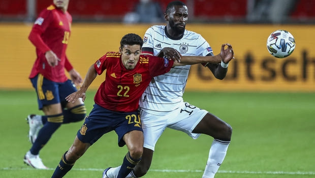 Spain's Jesus Navas, left, duels for the ball with Germany's Antonio Rudiger during their UEFA Nations League soccer match at the Mercedes-Benz Arena stadium in Stuttgart, Germany, Thursday, Sept. 3, 2020. (AP Photo/Matthias Schrader) AP