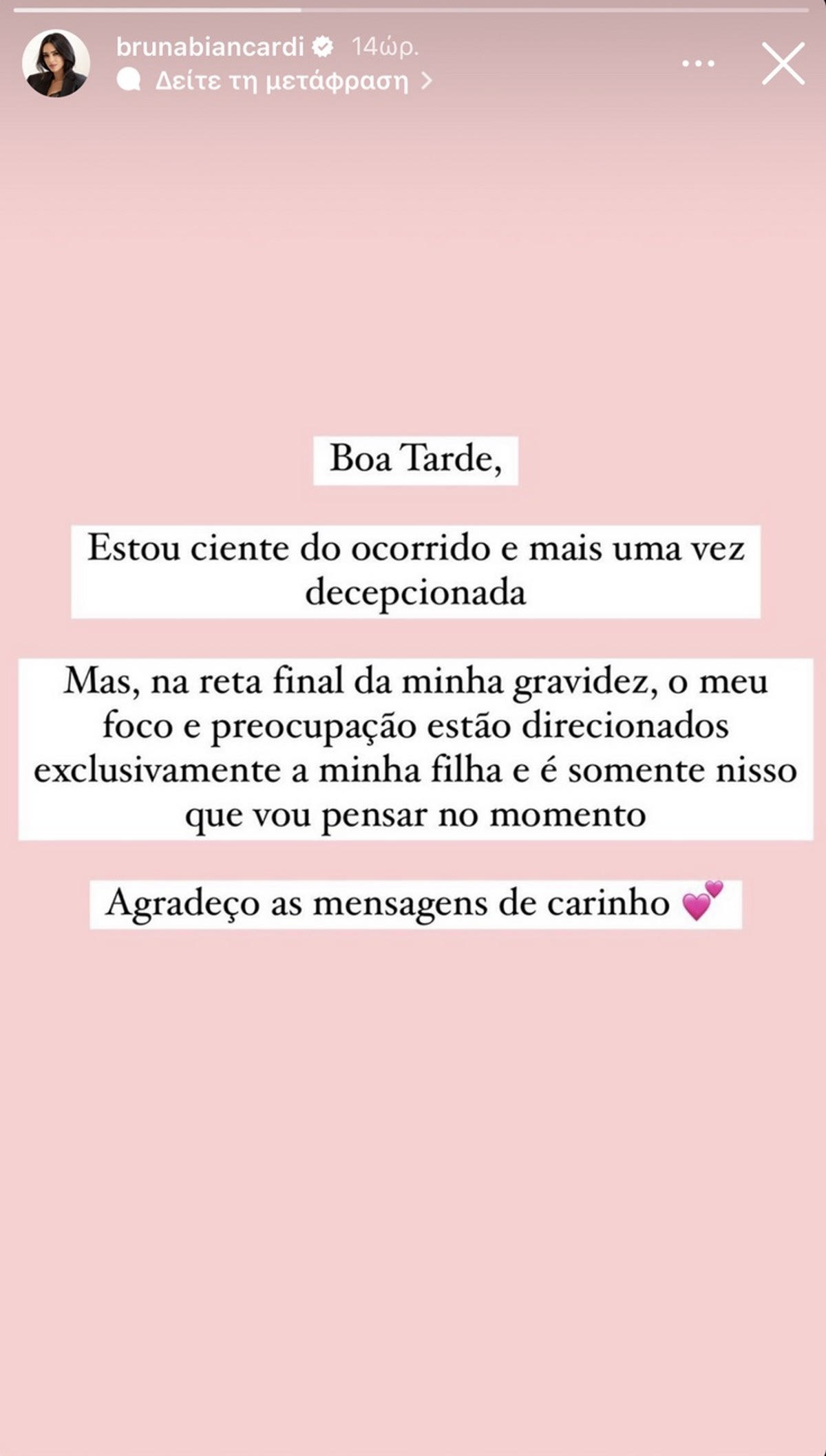 “Γνωρίζω τι συνέβη και είμαι απογοητευμένη για ακόμα μία φορά, αλλά βρίσκομαι στην τελική ευθεία της εγκυμοσύνης μου και εστιάζω και ανησυχώ αποκλειστικά για την κόρη μου, αυτό σκέφτομαι αυτή τη στιγμή. Εκτιμώ τα μηνύματα αγάπης που μου στέλνετε”.