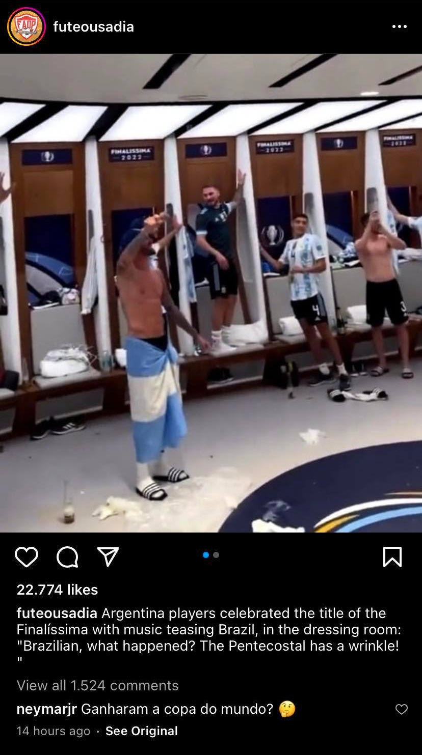 Ο Βραζιλιάνος επιθετικός σχολίασε μία ανάρτηση στο Instagram, όπου οι Αργεντινοί έχουν στήσει πάρτι στο Γουέμπλεϊ, γράφοντας χαρακτηριστικά: “Το Παγκόσμιο Κύπελλο κέρδισαν;”.