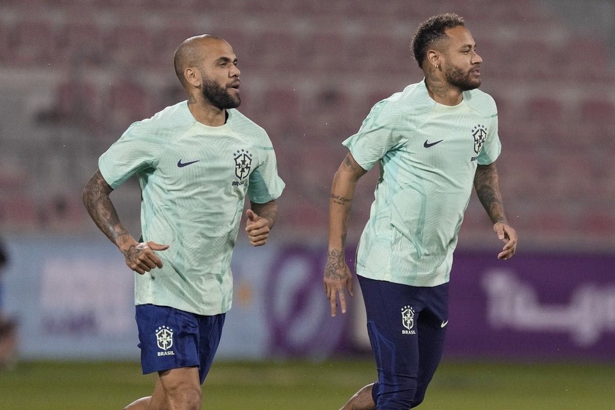 Brazil's Neymar, right, and Dani Alves attend a training session at the Grand Hamad stadium, in Doha, Qatar, Wednesday, Nov. 23, 2022. Brazil will play their first match in the World Cup against Serbia on Nov. 24. (AP Photo/Andre Penner) © Andre Penner/ AP IMGES