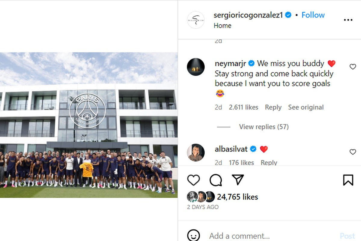 Ο Νεϊμάρ δεν έχασε την ευκαιρία και έσπευσε να σχολιάσει κάτω από τη δημοσίευση. Του ευχήθηκε ταχεία ανάρρωση, ώστε να γυρίσει το συντομότερο δυνατό για να του βάλει γκολ.