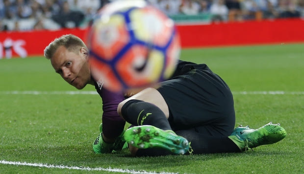 Barcelona's goalkeeper Marc-Andre Ter Stegen saves on an attempt to score by Real Madrid's Karim Benzema during a Spanish La Liga soccer match between Real Madrid and Barcelona, dubbed 'el clasico', at the Santiago Bernabeu stadium in Madrid, Spain, Sunday, April 23, 2017. (AP Photo/Francisco Seco)