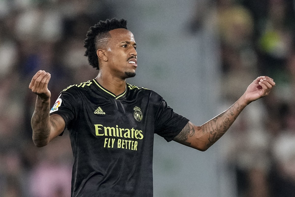 Real Madrid's Eder Militao during the Spanish La Liga soccer match between Elche and Real Madrid at the Martinez Valero Stadium in Elche, Spain, Wednesday, Oct. 19, 2022. (AP Photo/Jose Breton) AP