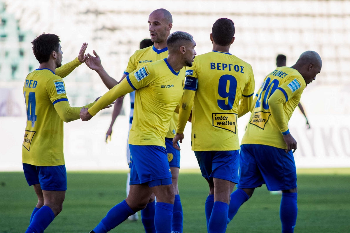 Οι παίκτες του Παναιτωλικού πανηγυρίζουν το γκολ που σημείωσε ο Ντουάρτε κόντρα στη Νίκη Βόλου Eurokinissi
