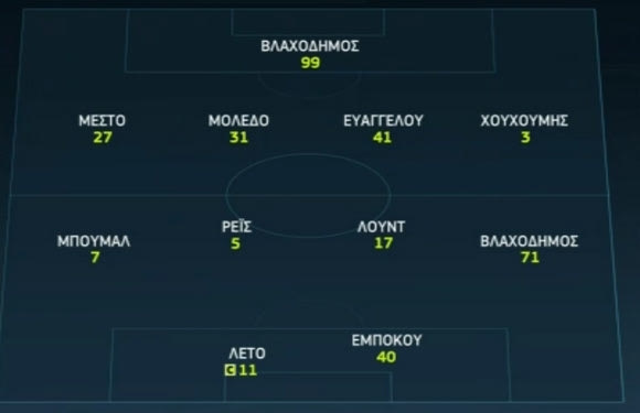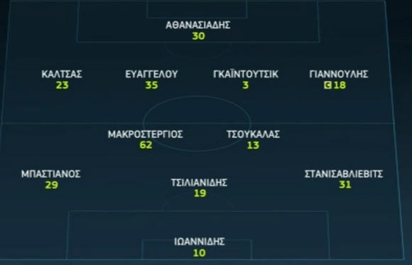 Με την συμπλήρωση 66′ αγώνα ο Ουζουνίδης έβγαλε από το ματς και τον Εμποκού και πέρασε στη θέση του τον Χατζηγιοβάνη ο οποίος έπαιξε πίσω από τον Μολίνς.
