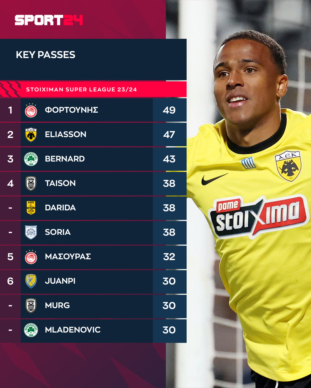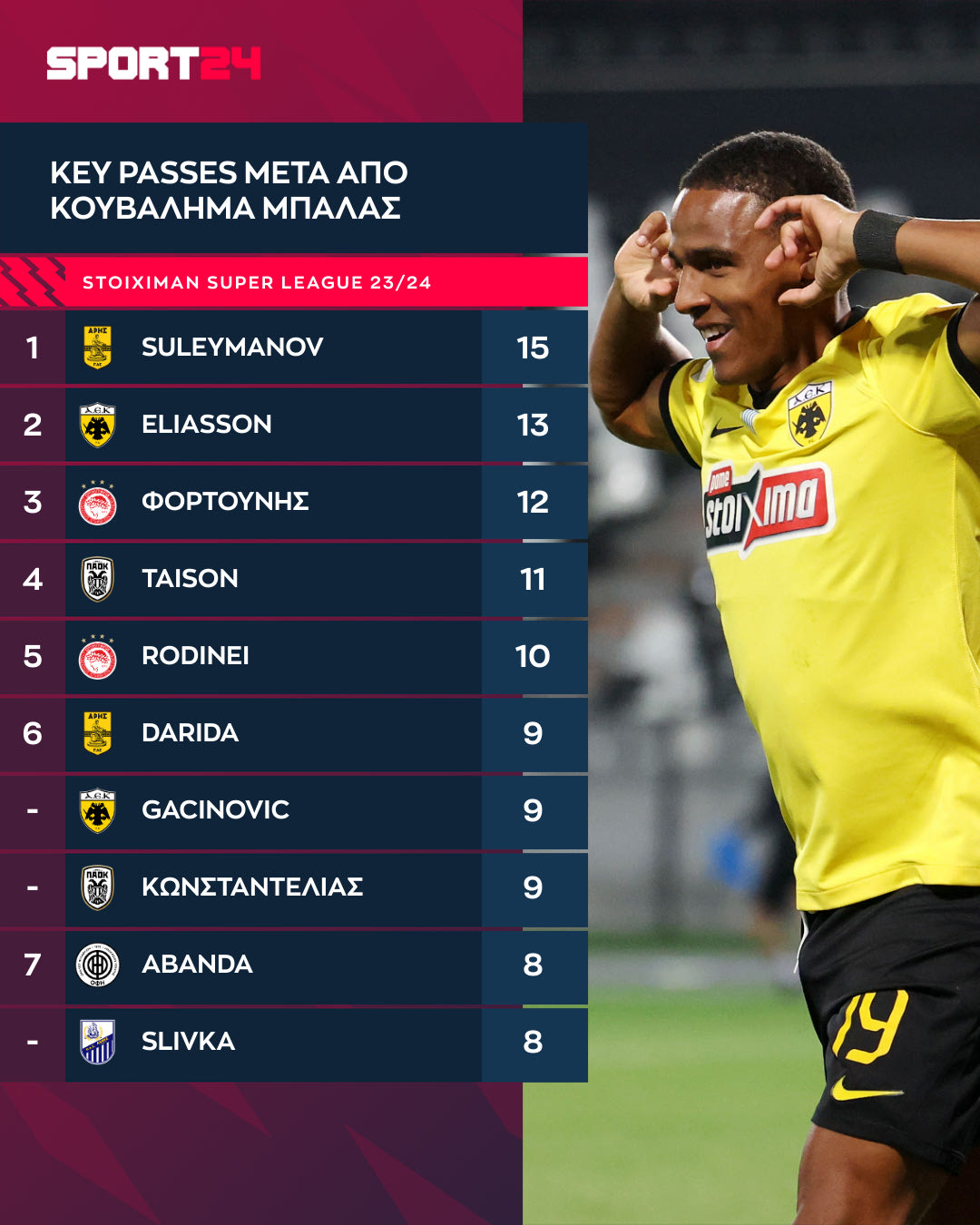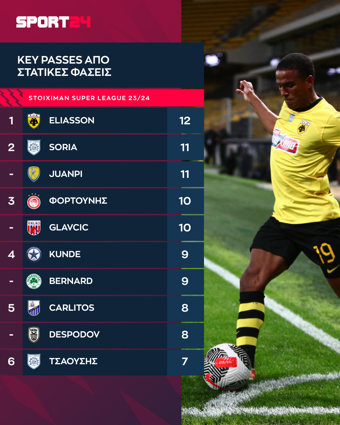 Την ίδια στιγμή, βέβαια, ο Ελίασον είναι στην κορυφή στις key passes από στατικές φάσεις με 12, με τους Σόρια και Χουάνπι να ακολουθούν με 11 και τον Φορτούνη να έχει 10.