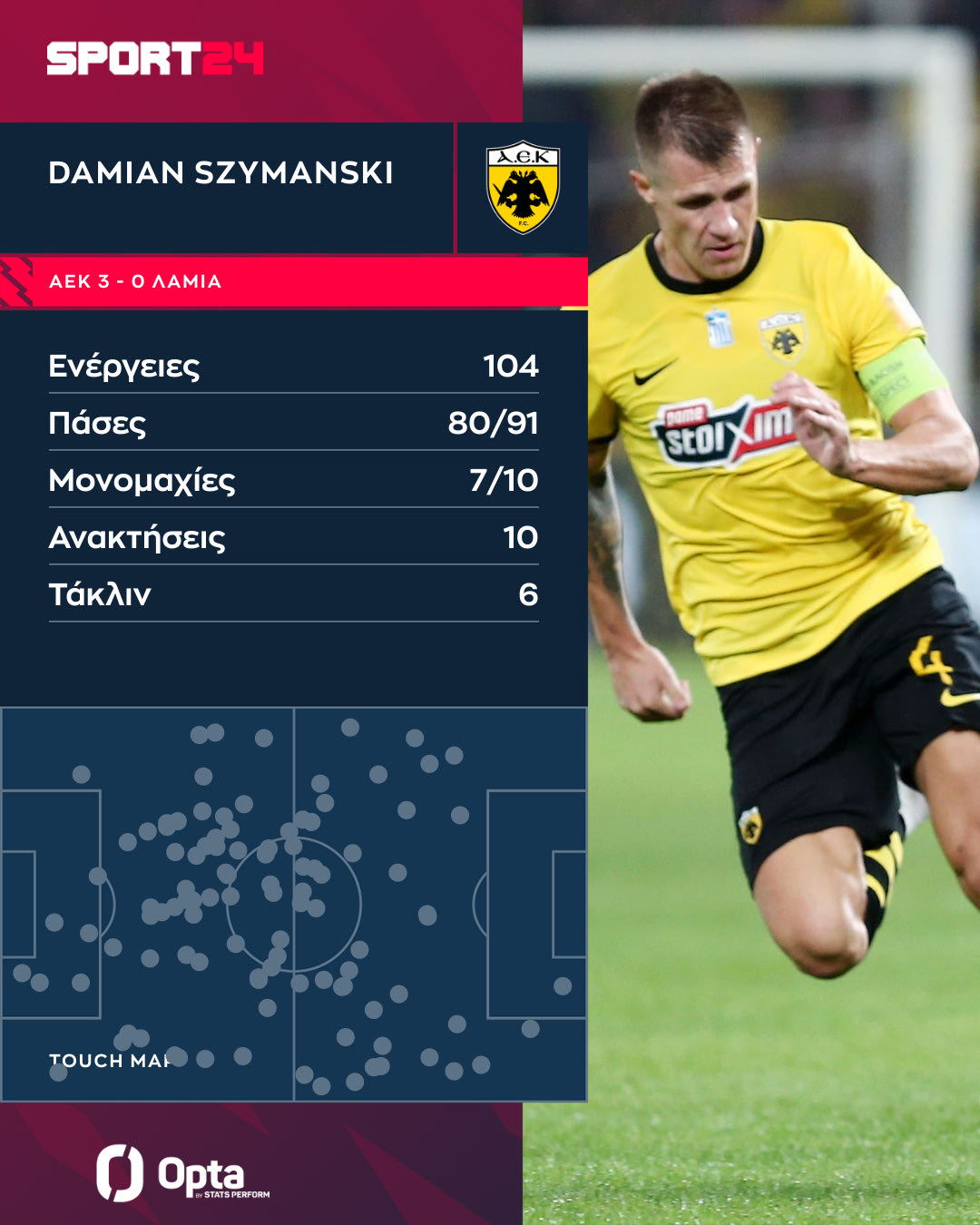 Ο Νταμιάν Σιμάνσκι δεν ξεχώρισε από τους συμπαίκτες του κόντρα στη Λαμία, ωστόσο οι αριθμοί της Opta δείχνουν ότι ο Πολωνός μέσος έκανε την πιο πληθωρική εμφάνιση της καριέρας του με την ΑΕΚ στο ελληνικό πρωτάθλημα.