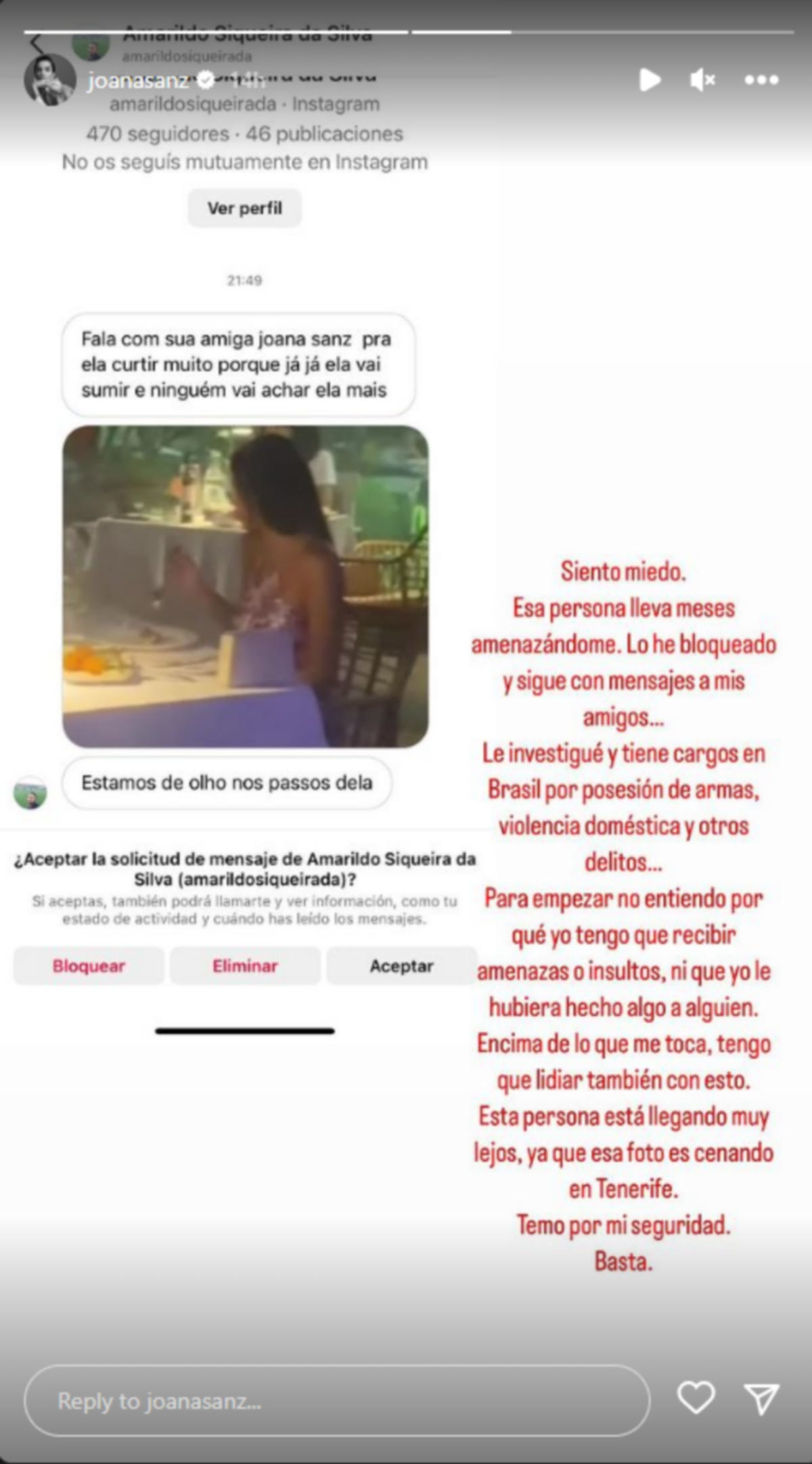 “Νιώθω φοβισμένη. Αυτό το άτομο με απειλεί εδώ και μήνες. Τον έχω μπλοκάρει και ακόμα στέλνει μηνύματα στους φίλους μου… Τον ερεύνησα και έχει κατηγορίες εις βάρος του στη Βραζιλία για οπλοκατοχή, οικογενειακή βία και άλλα εγκλήματα. Αρχικά δεν μπορώ να καταλάβω γιατί πρέπει να δέχομαι απειλές ή προσβολές, δεν έχω κάνει κάτι σε κάποιον.