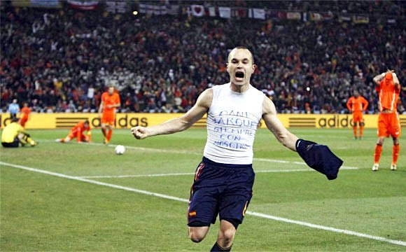 21. Ο Ινιέστα έχει πετύχει το νικητήριο γκολ της Ισπανίας επί της Ολλανδίας στον τελικό του Παγκοσμίου Κυπέλλου του 2010 και πανηγυρίζει φορώντας τη φανέλα που γράφει “Ντάνι Χάρκε, πάντα μαζί μας” (11/7/2010)