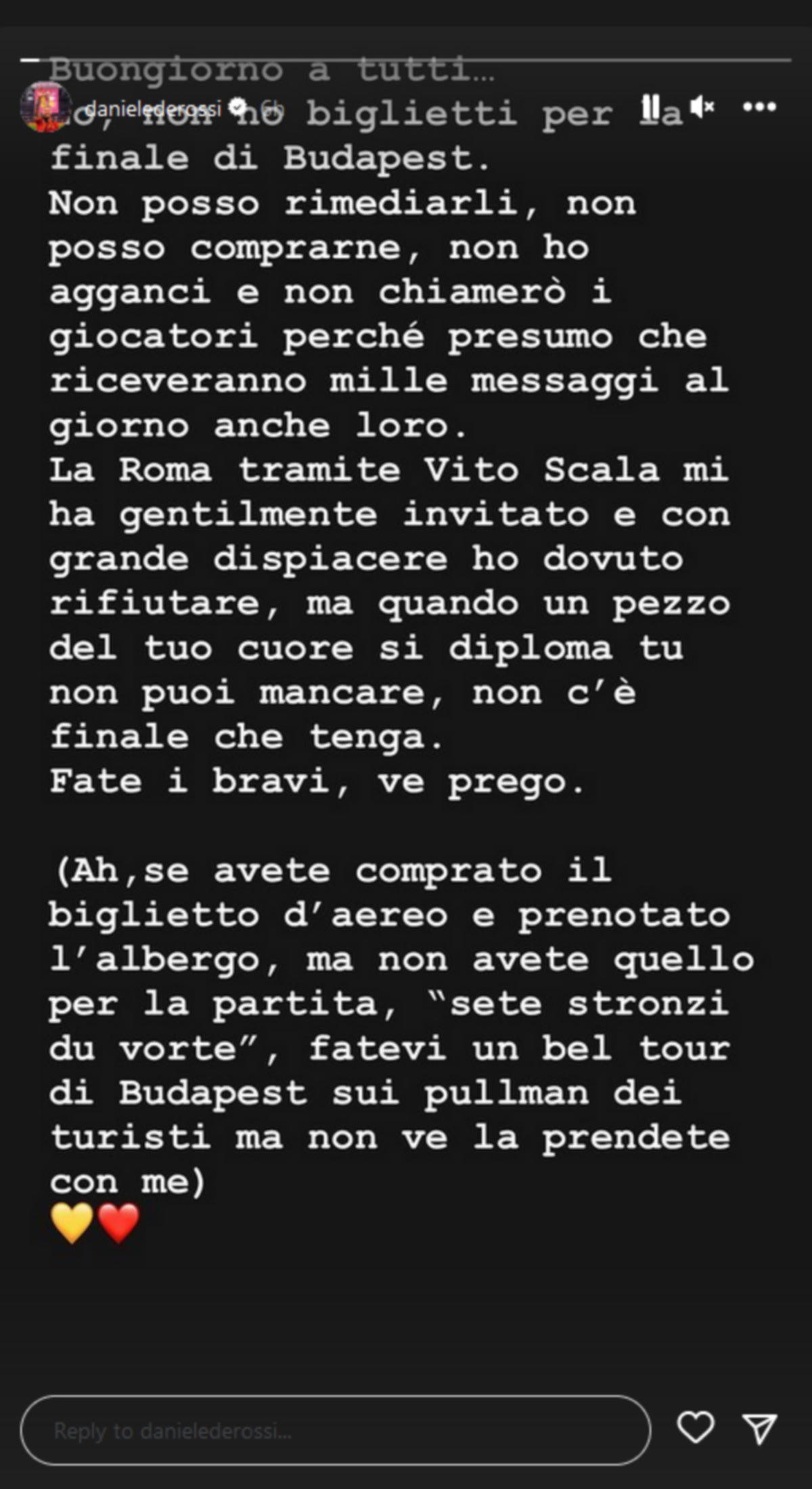 Ο άλλοτε υπαρχηγός των τζαλορόσι και νυν προπονητής, θέλησε να ξεκαθαρίσει μέσω Instastory πως δεν μπορεί να βοηθήσει ούτε έναν φίλαθλο στην προσπάθειά του να εξασφαλίσει την παρουσία στο γήπεδο και ξεκαθάρισε πως αν και είχε πρόσκληση από την Ρόμα, ούτε εκείνος θα είναι στην Ουγγαρία το βράδυ της 31ης Μαΐου.