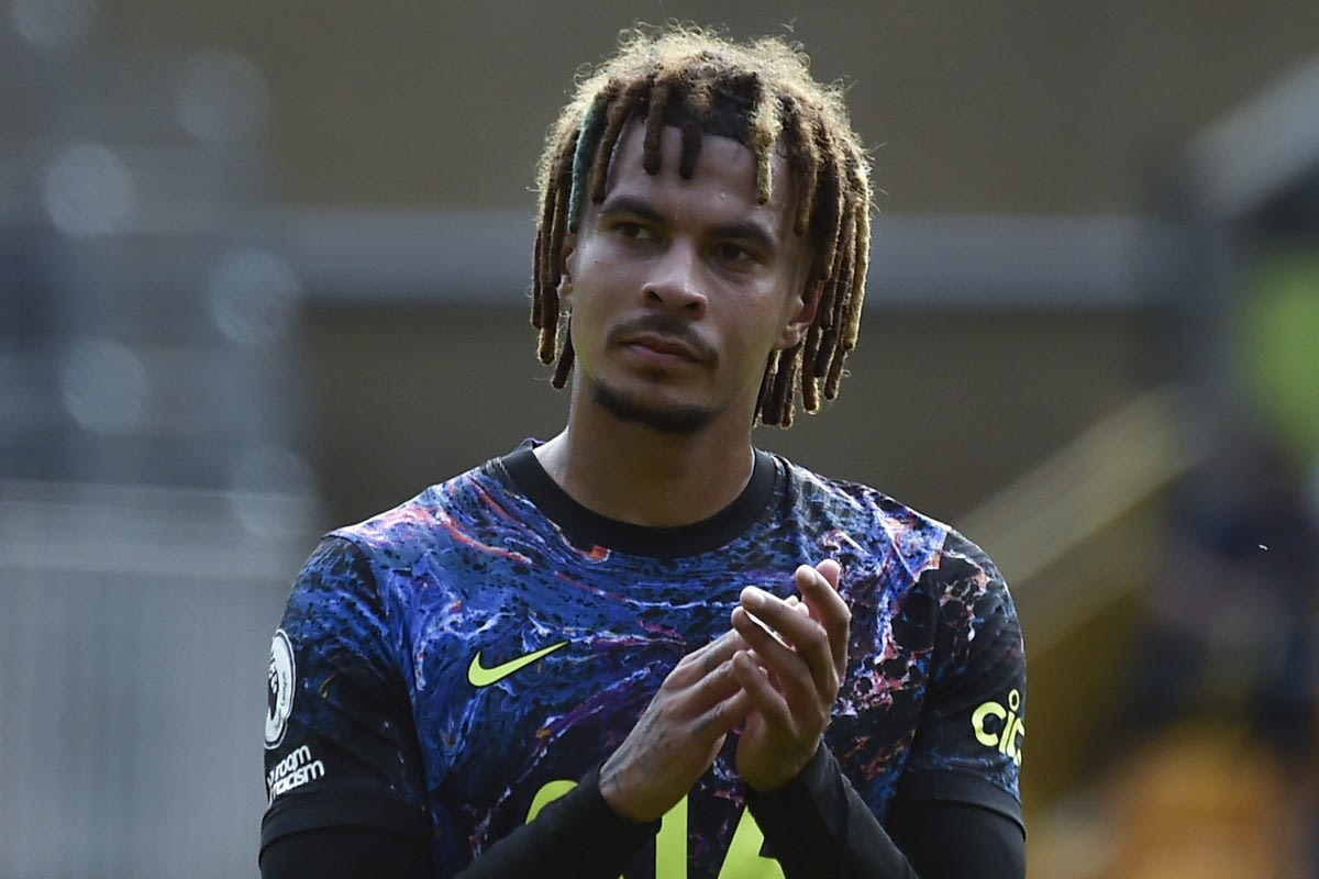 Tottenham's Dele Alli during the English Premier League soccer match between Wolverhampton Wanderers and Tottenham Hotspur at Molineux stadium in Wolverhampton, England, Sunday, Aug. 22, 2021. (AP Photo/Rui Vieira)