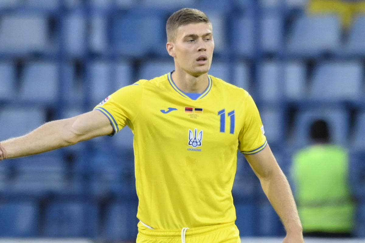 Ο Αρτέμ Ντόβμπικ πανηγυρίζει γκολ του με τη φανέλα της εθνικής Ουκρανίας 2022 AP Photo/Hakob Berberyan