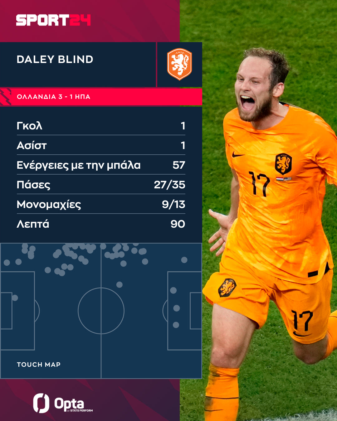 Από κοντά, βέβαια, κι ο έτερος φουλ μπακ της Ολλανδίας, Ντέιλι Μπλιντ. Ο 32χρονος αμυντικός του Άγιαξ λειτούργησε σε αντίστοιχη λογική με τους Ντούμφρις, αλλά πιο χαμηλά μέσα στο γήπεδο. Βέβαια, σε μία απ’ τις ελάχιστες φορές που πέτυχε περιοχή, κατάφερε κι εκείνος να στείλει την μπάλα στα δίχτυα με υπέροχο πλασέ.