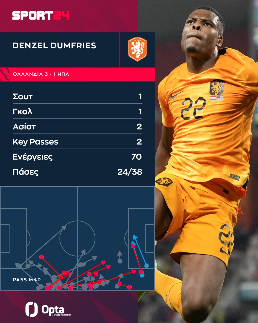 Ο 26χρονος αμυντικός δημιούργησε τεράστιο πρόβλημα στον Άντονι Ρόμπινσον, ο οποίος αδυνατούσε να τον… τιθασεύσει. Συγκεκριμένα, ο Ντούμφρις είχε 70 ενέργειες με την μπάλα, μοιρασμένες ισόποσα και στις δύο πλευρές του γηπέδου, ενώ είχε και 24/38 πάσες. Παράλληλα, κατάφερε να μετουσιώσει σε γκολ τη μοναδική τελική του στον αγώνα, “κλειδώνοντας” ουσιαστικά τη νίκη/πρόκριση για τους οράνιε.