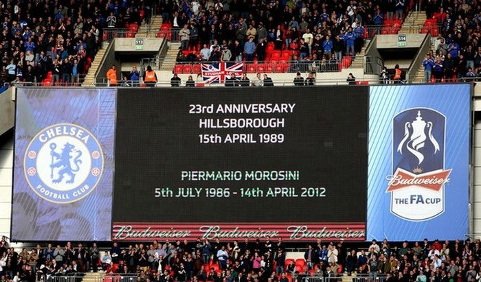 Ο δεύτερος ημιτελικός του Κυπέλλου Αγγλίας συνέπεσε με την 23η επέτειο από την μεγαλύτερη ποδοσφαιρική τραγωδία των αγγλικών γηπέδων, με αποτέλεσμα να είναι προγραμματισμένη ενός λεπτού σιγή πριν την πρώτη σέντρα στο Τότεναμ-Τσέλσι (1-5).