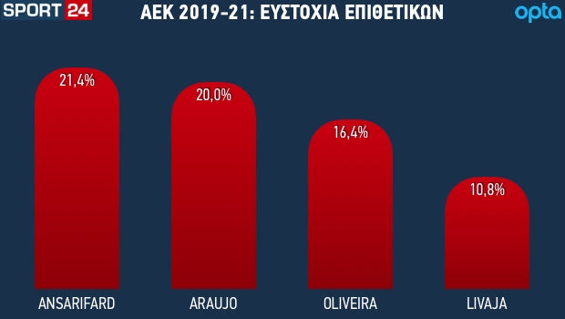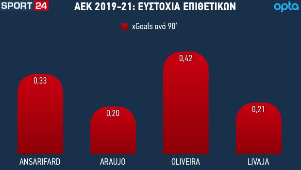 Όπως φαίνεται και στο παρακάτω γράφημα, ο Ανσαριφάρντ είναι ο επιθετικός της ΑΕΚ με τη μεγαλύτερη ευστοχία σε τελικές προσπάθειες απ’ το καλοκαίρι του 2019, όταν και άρχισε η Opta να καλύπτει τη Super League.