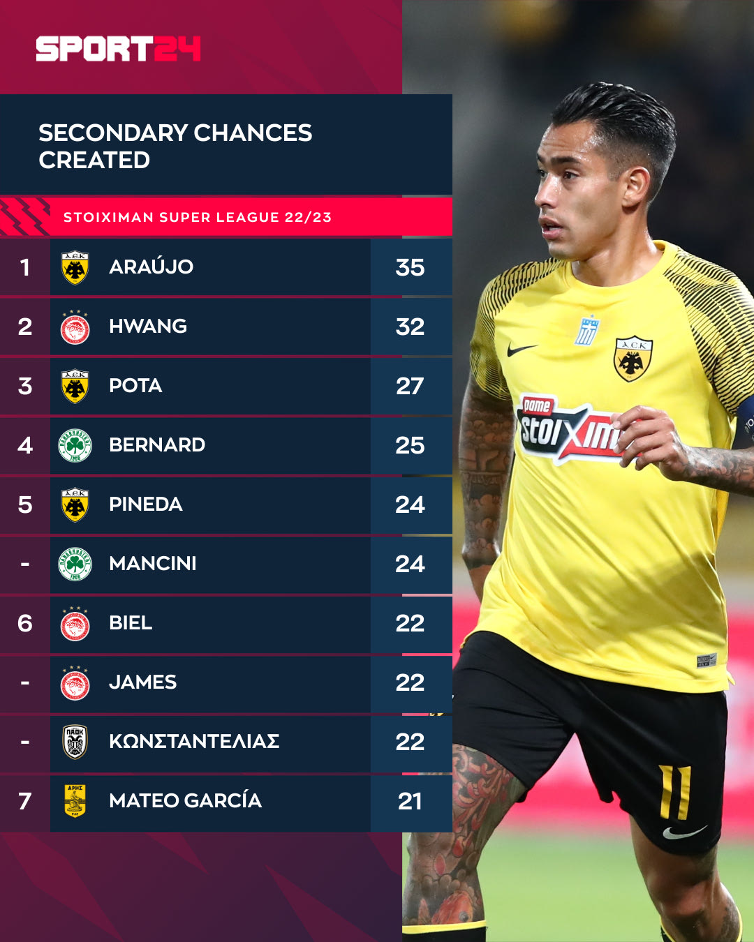 Η Opta τις ονομάζει Secondary Chances Created, εμείς μπορούμε απλά να πούμε ότι είναι οι φορές που ένας παίκτης δίνει την μπάλα ακριβώς πριν την πάσα και την τελική. Πρώτος και εδώ ο Αραούχο, που το έκανε 35 φορές.