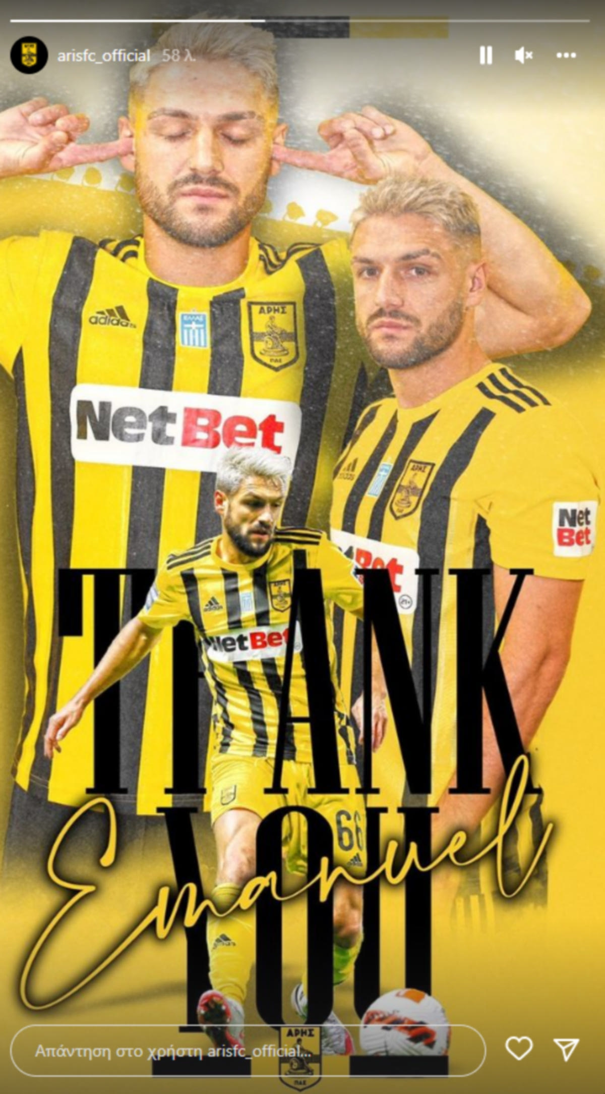 Ο Άρης ευχαρίστησε τον Εμάνουελ Σάκιτς για τη συνεισφορά του στην ομάδα τη διετία που αγωνίστηκε σε αυτή μέσω instagram story.