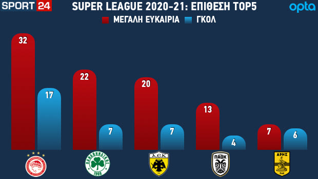Ο Άρης έφτιαξε μακράν τις λιγότερες μεγάλες ευκαιρίες, μόνο επτά. Με αυτές όμως πέτυχε έξι γκολ, δύο περισσότερα από τον ΠΑΟΚ και ένα λιγότερο από όσα πέτυχαν ΑΕΚ και Παναθηναϊκός που είχαν υπέρ-τριπλάσιες μεγάλες ευκαιρίες.