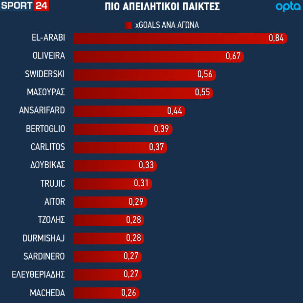 Θα μπορούσε βέβαια αυτό το επιθετικό overperfomarnce να οφείλεται σε έναν παίκτη, σε έναν επιθετικό που είναι “καυτός” και βάζει περισσότερα απ’αυτά που πρέπει, όπως πχ ο Ελ Αραμπί.