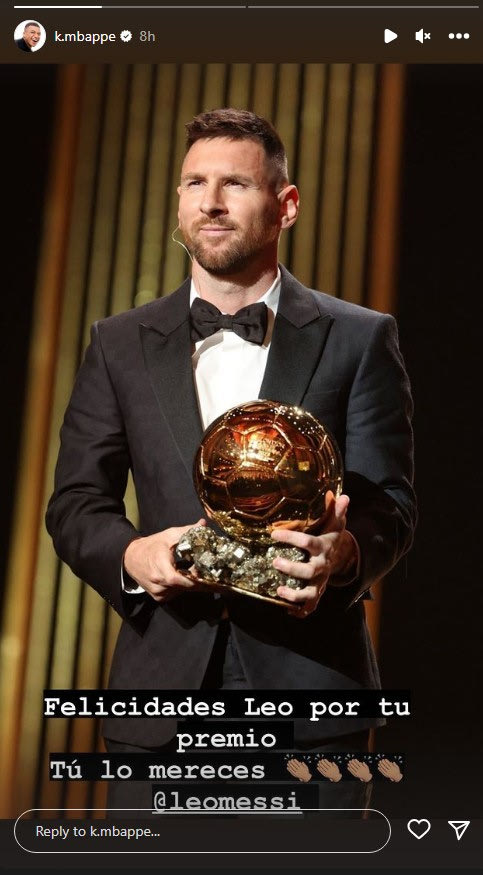 “Συγχαρητήρια Λέο για το βραβείο σου. Το αξίζεις“, έγραψε στο στόρι του ο Γάλλος σούπερ σταρ της Παρί Σεν Ζερμέν.