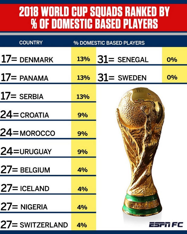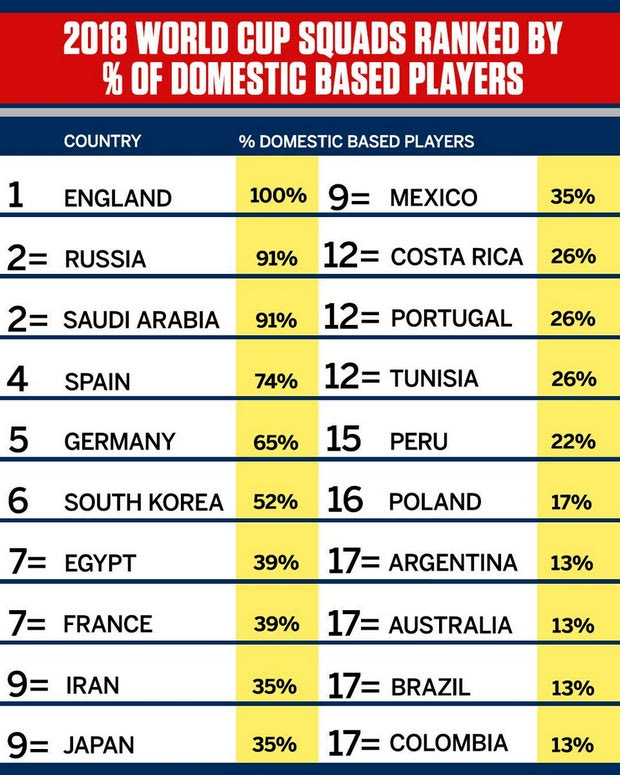 Μετά την ανακοίνωση και των τελευταίων αποστολών για το Παγκόσμιο Κύπελλο της Ρωσίας το οποίο ξεκινά στις 14 Ιουνίου έχουν προκύψει πολλά και ενδιαφέροντα στατιστικά. Ένα από αυτό έρχεται από το ESPN το οποίο καταγράφει το ποσοστό που καταλαμβάνουν οι παίκτες που παίζουν στο πρωτάθλημα της χώρας που θα εκπροσωπήσουν.