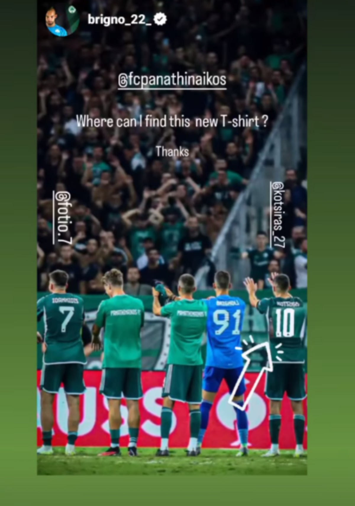 Η επιβεβαίωση του πόσο καλό κάνει σ’ όλη την ομάδα ο εσωτερικός ανταγωνισμός για την ενδεκάδα (μετά το ξεπέταγμα του Βαγιαννίδη) και το πιο “γεμάτο” παιχνίδι του Κώτσιρα, που έκανε το… δαιμόνιο Αλμπέρτο Μπρινιόλι να “πειράξει” την πανηγυρική φωτογραφία των παικτών του Παναθηναϊκού, βάζοντας στη φανέλα του το… Νο10 και γράφοντας “που μπορώ να βρω αυτή την καινούρια φανέλα; Ευχαριστώ…”.