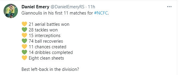 “Ο Γιαννούλης στα 11 πρώτα παιχνίδια του με τη Νόριτς. 21 κερδισμένες μάχες στον αέρα 28 επιτυχημένα τάκλιν, 15 κλεψίματα, 74 ανακτήσεις μπάλας, 11 ευκαιρίες που έχουν δημιουργηθεί απ’ αυτόν, 14 ολοκληρωμένες ντρίμπλες. 8 φορές ανέπαφη εστία για την ομάδα. Είναι ο καλύτερος αριστερός μπακ στην κατηγορία;”, αναφέρει σχετικό tweet για τον Γιαννούλη.