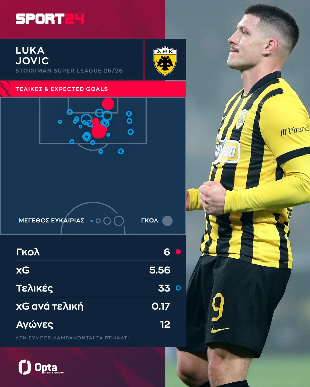Σε αυτά τα 12 παιχνίδια ο Γιόβιτς έχει εκτελέσει 33 φορές. Οι τρεις εξ αυτών ήταν από την άσπρη βούλα, όλες τους εύστοχες. Με τα πέναλτι η συνολική απειλή του Σέρβου φορ ανέρχεται σε 5.56 xGoals, ενώ έχει έξι τέρματα.