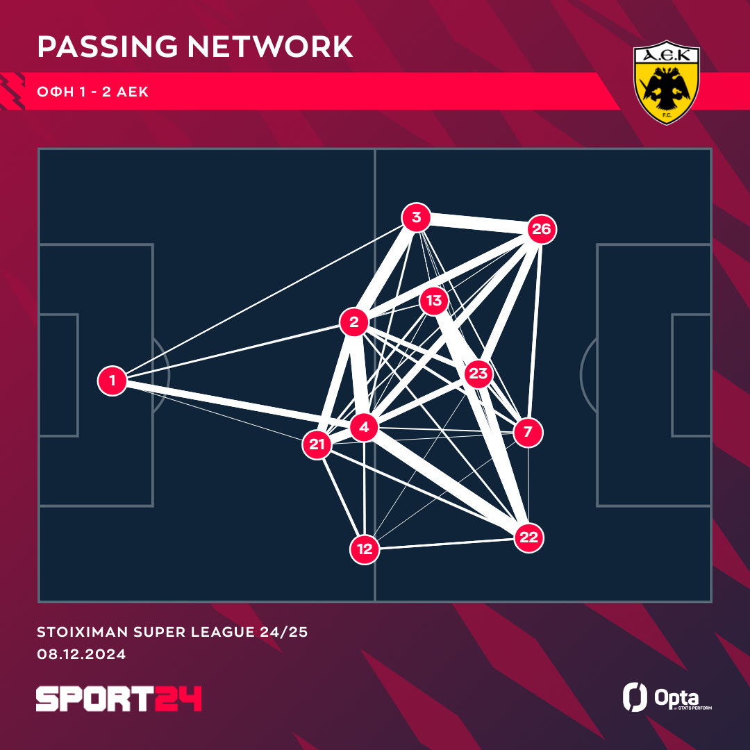 Η “οπισθοχώρηση” του Λιβάι Γκαρσία φαίνεται στο δίκτυο μεταβιβάσεων της ΑΕΚ, όπου απεικονίζεται (και) ο μέσος χώρος δράσης των ενεργειών των ποδοσφαιριστών.