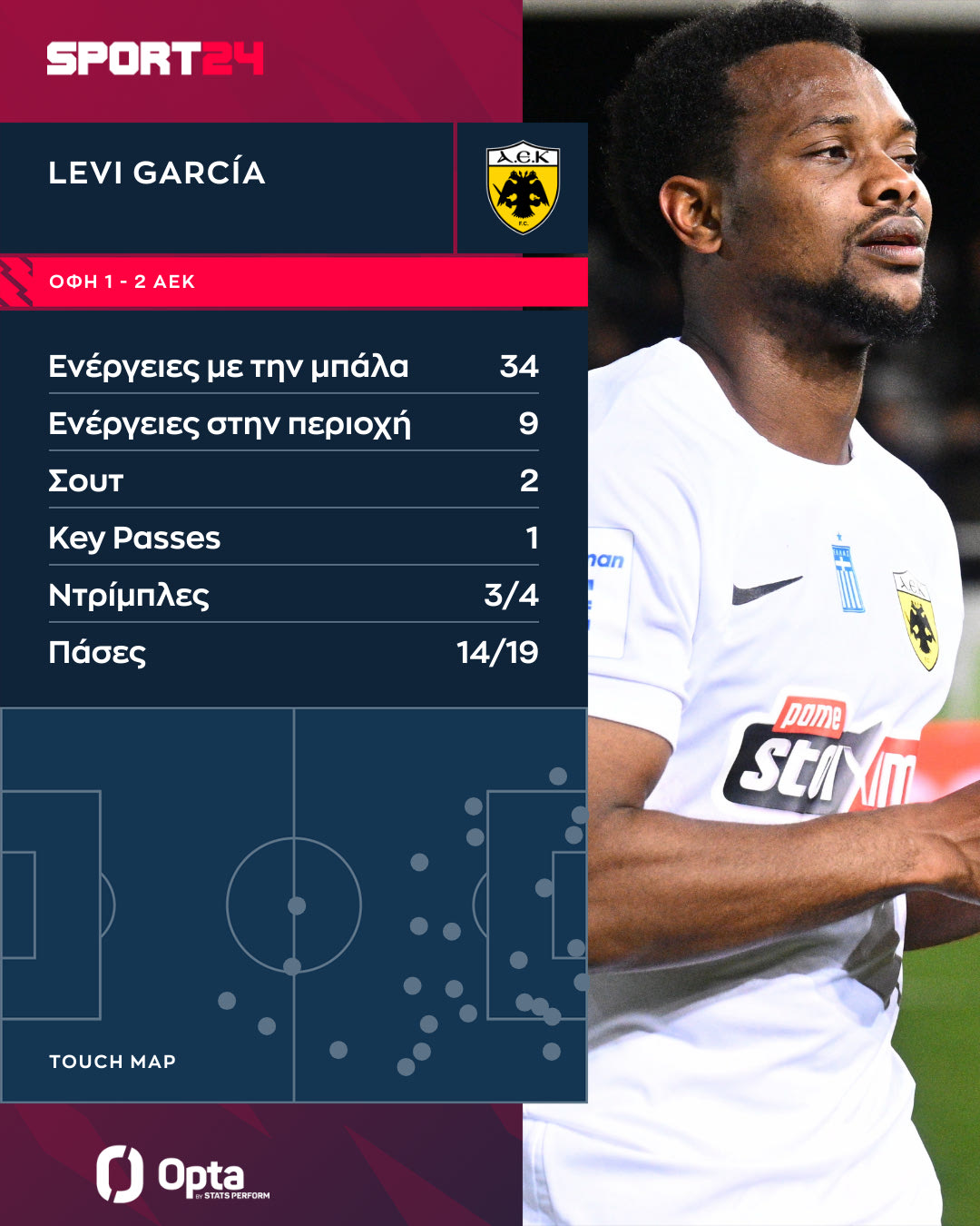 Ο Λιβάι Γκαρσία ολοκλήρωσε το παιχνίδι με 34 ενέργειες με την μπάλα και εννιά εξ αυτών στην περιοχή του Χριστογεώργου. Παρότι φορ οι ενέργειές του απλώθηκαν και εκτός περιοχή, κυρίως προς τα δεξιά.